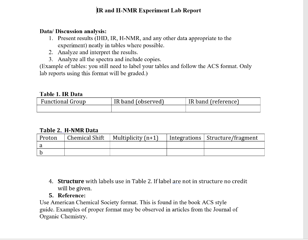 Chemistry Lab Resources (for CHM 1XX and 2XX Labs) - Purdue University What a table can tell you. A table helps organise information so it is easier to see patterns and relationships. If a variable is continuous the table reveals a lot more information. It may show the range, interval, and number of readings. Limitations. It can be difficult to see numerical relationships and patterns. A graph may make these clearer. How To Write A Lab Report | Step-by-Step Guide & Examples - Scribbr A lab report conveys the aim, methods, results, and conclusions of a scientific experiment. The main purpose of a lab report is to demonstrate your understanding of the scientific method by performing and evaluating a hands-on lab experiment. This type of assignment is usually shorter than a research paper. How to Write a Lab Report - Steps and Template - ThoughtCo Title Page. Not all lab reports have title pages, but if your instructor wants one, it would be a single page that states: . The title of the experiment. Your name and the names of any lab partners. Your instructor's name. The date the lab was performed or the date the report was submitted.
